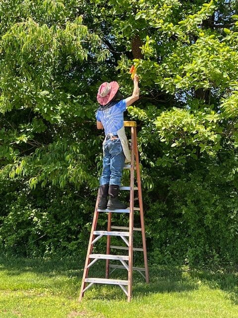 Not having much luck with the water gun approach, Hiroshi gabbed his bee transport box and and climbed the ladder once more to capture the bees.